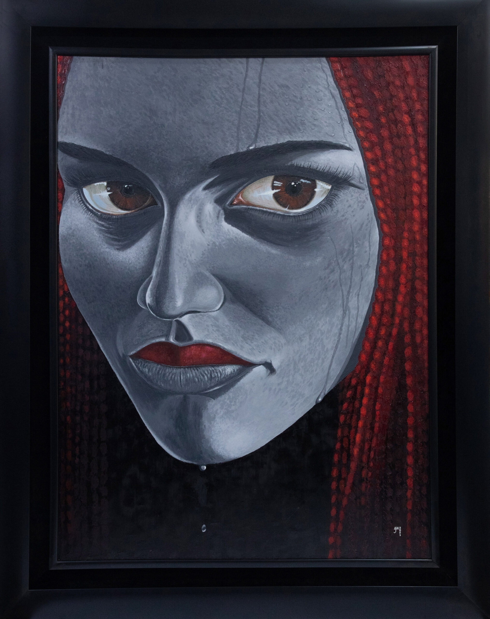 The rage that resides within is deeply rooted and powerful. Hiding undetected for so long till it turns the braids red. A result of unresolved anger causing overwhelming sadness and agony. In pain, she paints her upper lip and leaves the lower one bare. A pain, which its source is a mystery and unknown to all, but yet bears a defiance that is loud. This endless struggle with stoicism evokes sweat drops down her face.