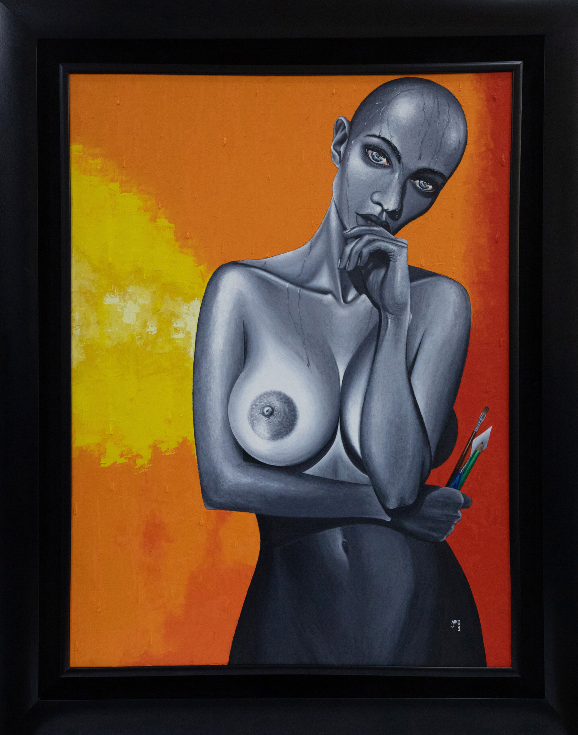 The Artist Aik, embodies his creative essence and finds expression in the form of a woman who paints exclusively under the sun, the only source of natural light in which he paints. Whether basking in its warm embrace or finding solace under a shelter from rain, he, represented by her, never paints with artificial light. Deftly she wields her tools—a pencil, brush, and palette knife—with finesse, and strokes intricately with precision, transforming her intangible thoughts to tangible masterpieces. All her paintings are impasto, but highly detailed. As beads of sweat trickle down her body, she becomes a living canvas, a reflection of her laborious physical and spiritual commitment to her craft until a threshold of perfection is attained. Like one who has conceived and is about to bear a unique child of which there is no duplicate, she critiques every painting for days. Knowing that every concept is a new being brought into this world. One without repetition. A whole and complete story.