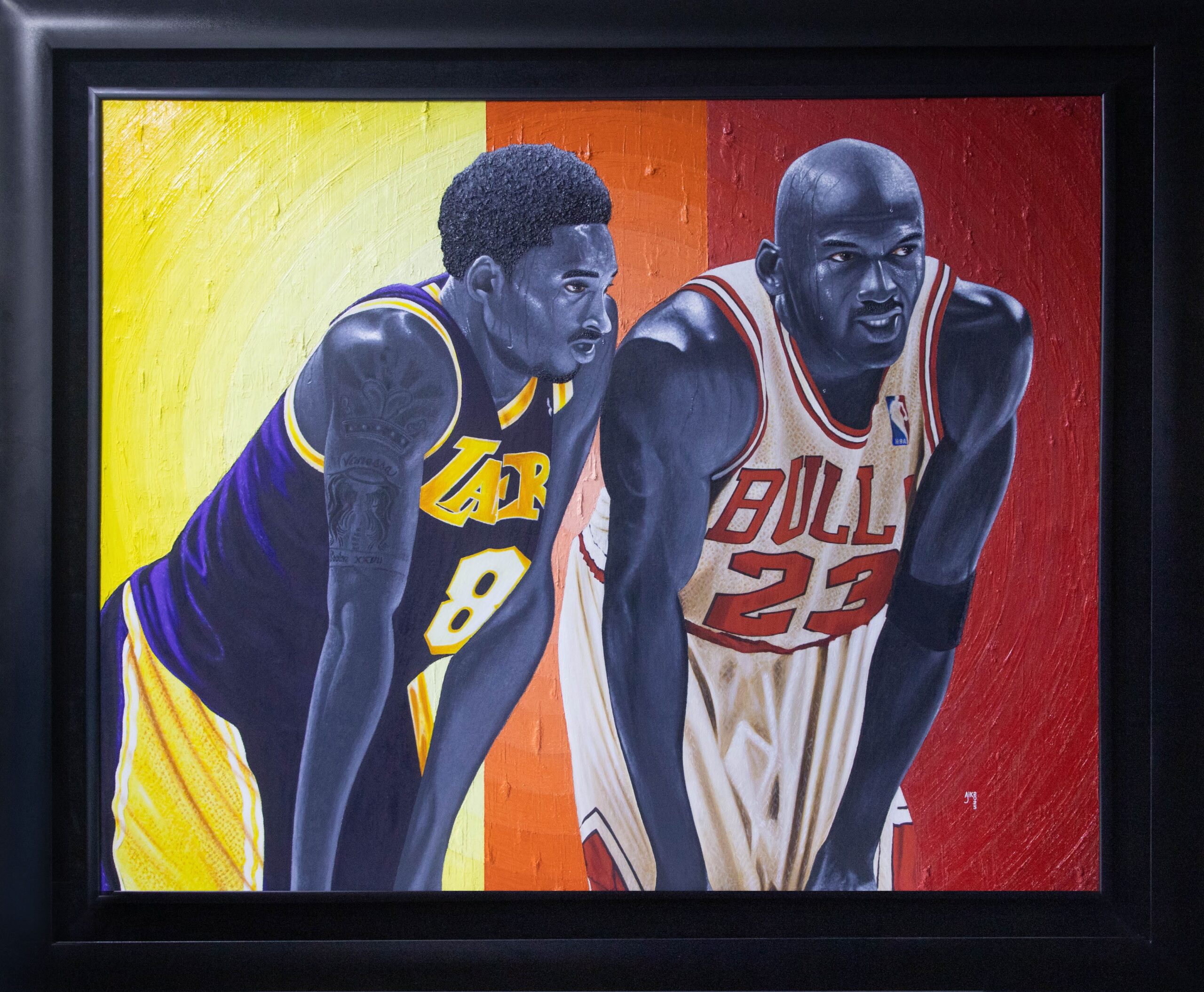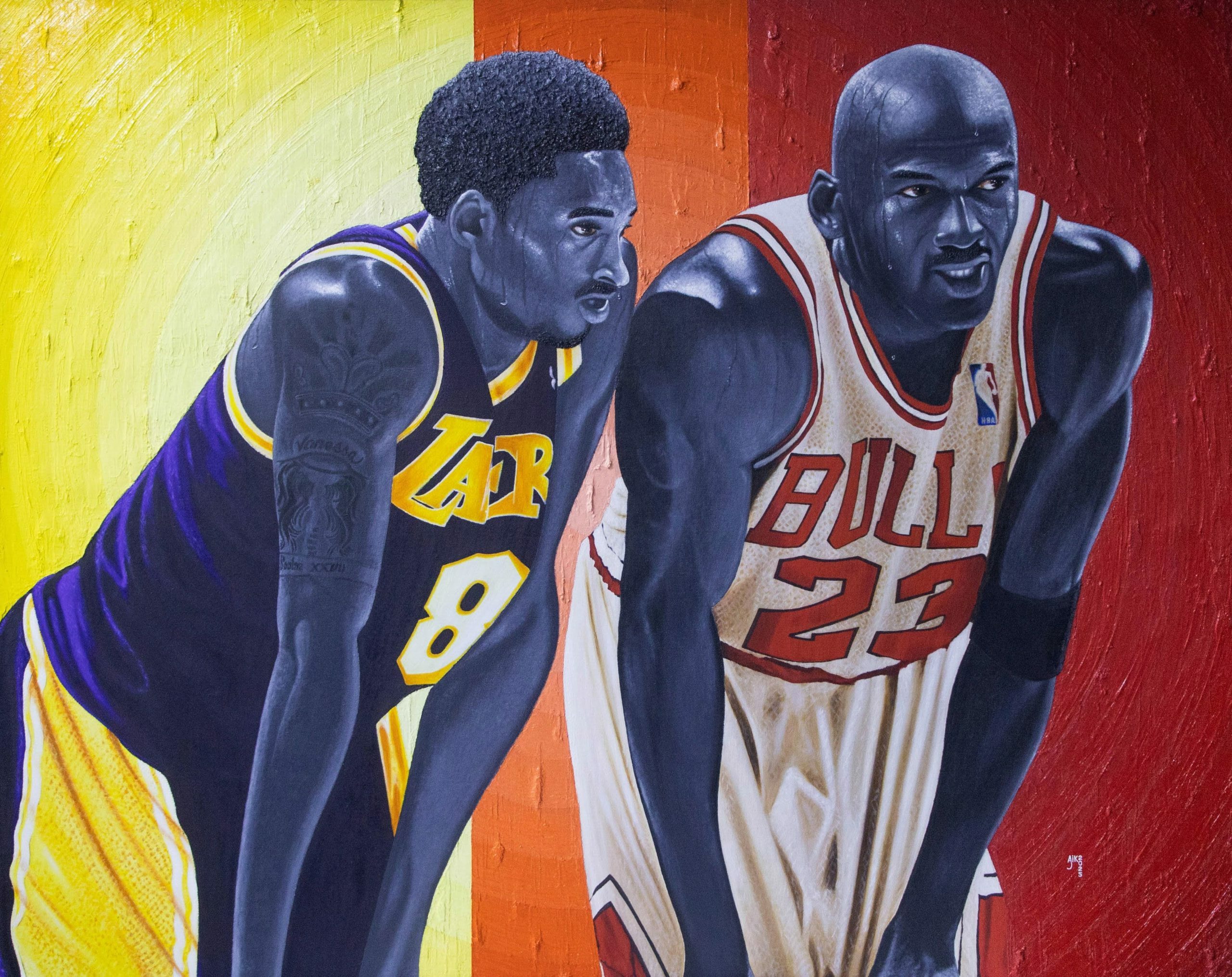 On the right bends the GOAT of the game, the Black Cat, His Airness, and the relentless force of Chicago Bulls – Michael Jordan, clad in white and crimson red, his iconic No.23 jersey soaked with the sweat of wisdom and battle. On the left, Kobe Bryant, our eternal Mamba, bent in Lakers golden glow, his gaze locked deep in reverence.